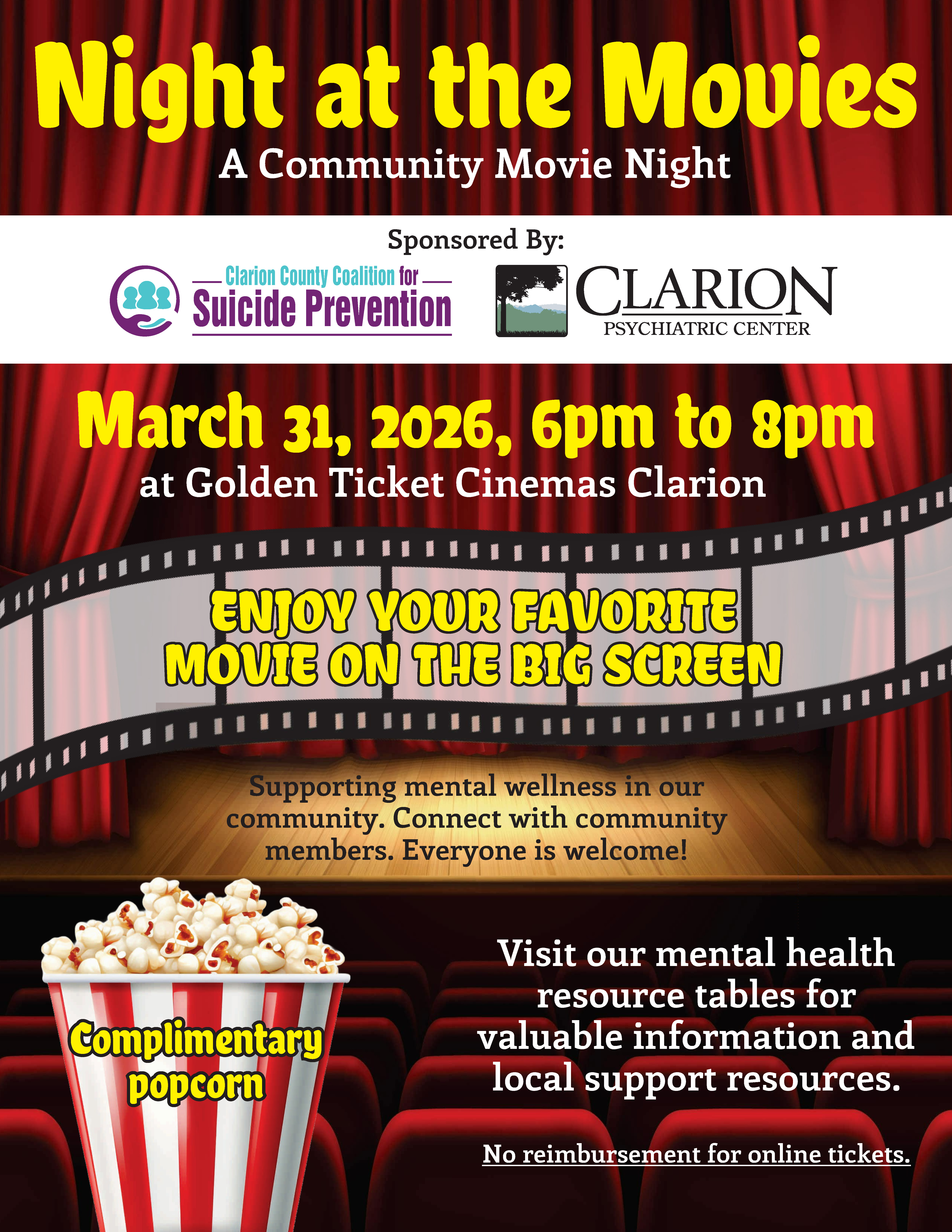 In-Person :: Free The Clarion County Coalition for Suicide Prevention (CCCSP) is hosting a community movie night open to everyone. Mental health resource tables will be available on-site with local […]
