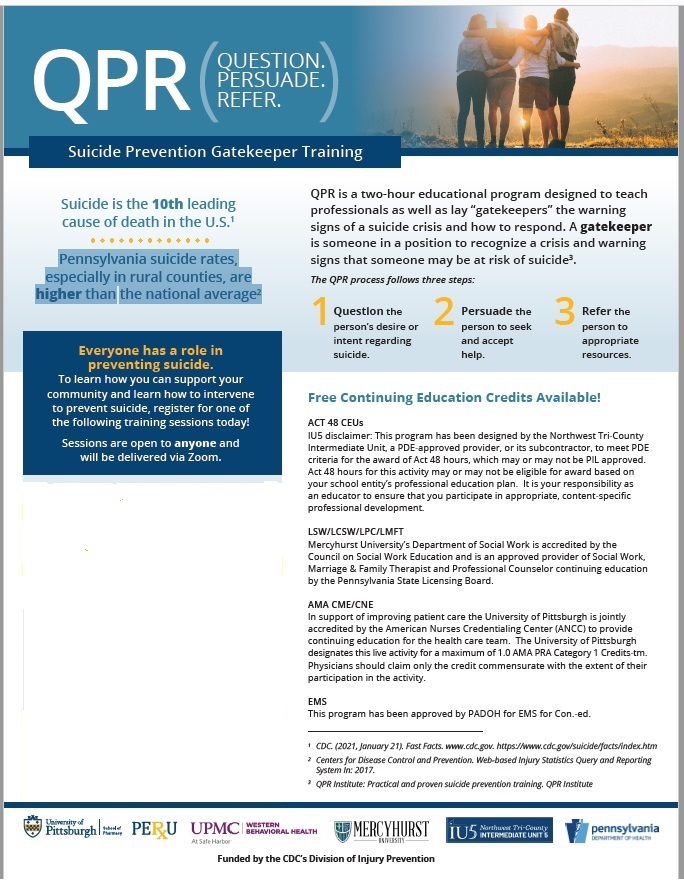 Pennsylvania suicide rates, especially in rural counties, are higher than the national average. QPR is a two-hour educational program designed to teach professionals as well as lay “gatekeepers” the warning signs of a suicide crisis and how to respond. A gatekeeper is an individual who can recognize a crisis and the warning signs of someone possibly contemplating suicide. Anyone can become a gatekeeper: parents. friends, neighbors, teachers, athletic coaches, ministers, doctors, nurses, office supervisors, squad leaders, foremen, police officers, advisors, caseworkers, firefighters, etc. Gatekeepers come from all walks of life and do not require any prior training or education.