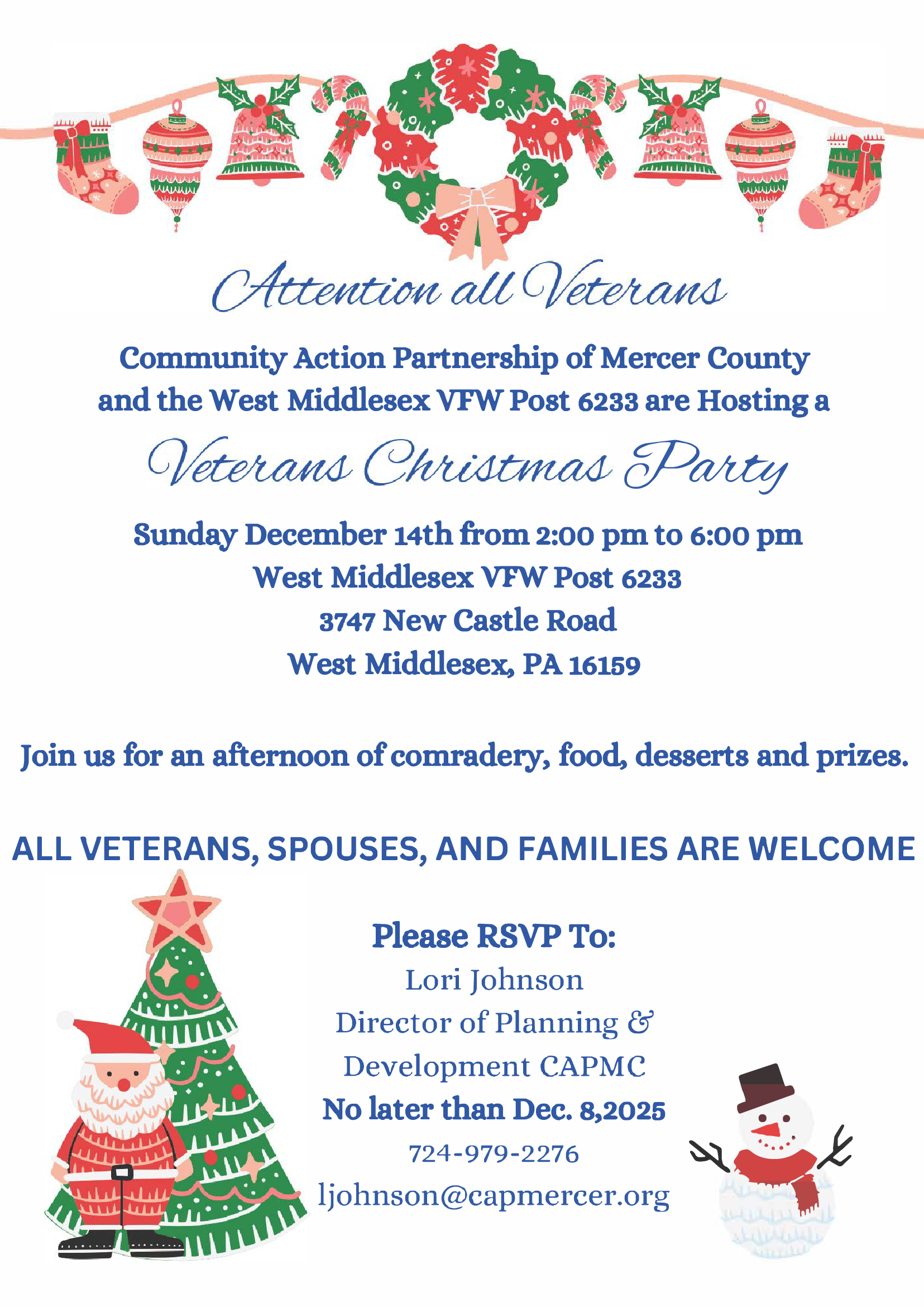 RSVP by December 5, 2025: Contact Lori Johnson, Director of Planning & Development, Community Action Partnership of Mercer County, at ljohnson@capmercer.org or call 724-979-2276.