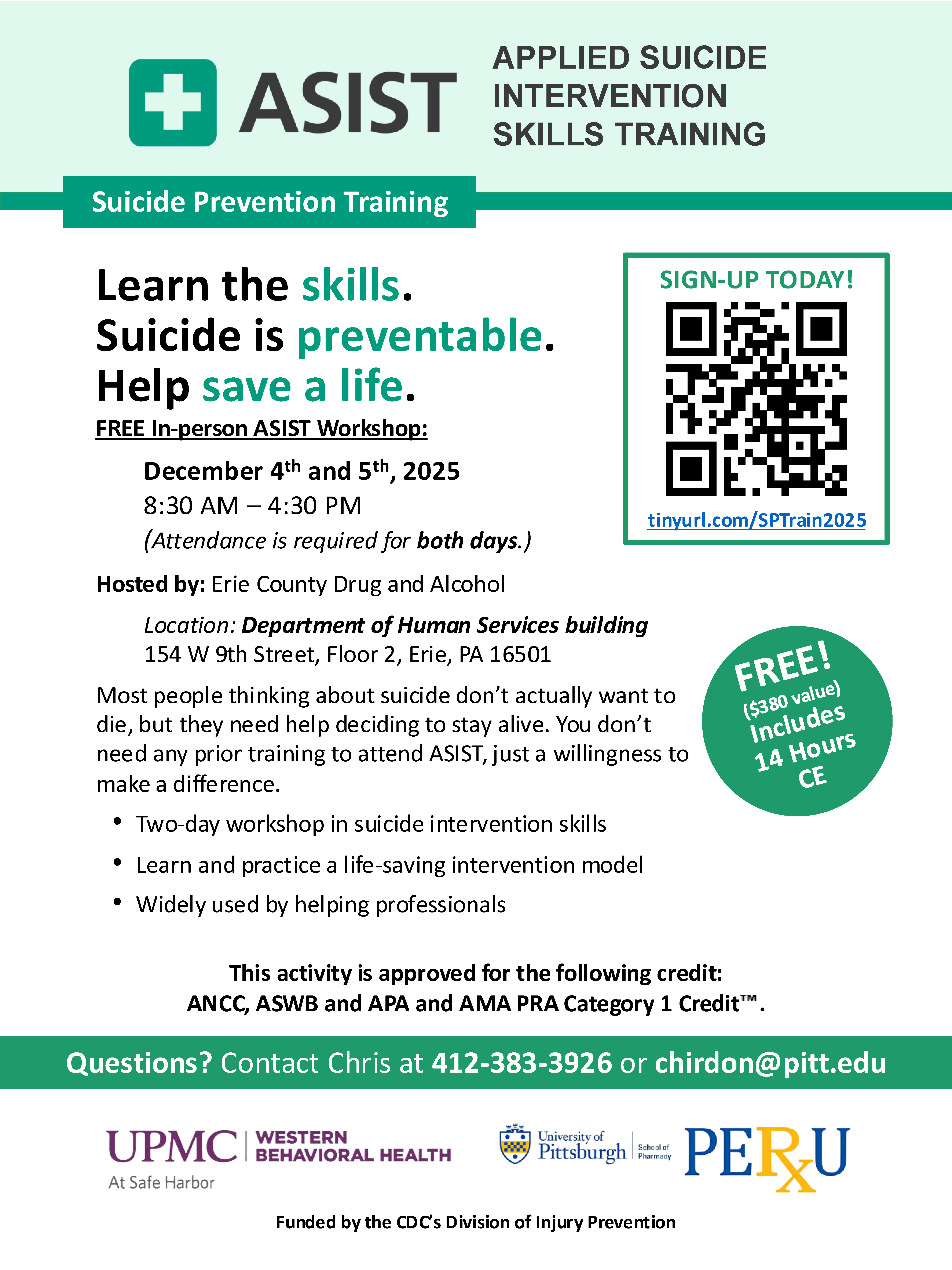 Training Details Duration2 Days (8:30 AM - 4:30 PM each day) CostFree ApprovalsThis activity is approved for the following credit: AMA PRA Category 1 Creditâ„¢, ANCC, ASWB, and AAPA Category 1 CME. Quantity14 hours CE ProviderPitt PERU and UPMC Western Behavioral Health at Safe Harbor Erie County Drug and Alcohol is sponsoring this training which […]