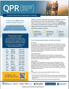 Pennsylvania suicide rates, especially in rural counties, are higher than the national average. QPR is a two-hour educational program designed to teach professionals as well as lay “gatekeepers” the warning signs of a suicide crisis and how to respond. A gatekeeper is an individual who can recognize a crisis and the warning signs of someone possibly contemplating suicide. Anyone can become a gatekeeper: parents. friends, neighbors, teachers, athletic coaches, ministers, doctors, nurses, office supervisors, squad leaders, foremen, police officers, advisors, caseworkers, firefighters, etc. Gatekeepers come from all walks of life and do not require any prior training or education.